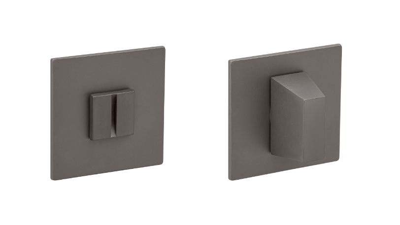 Zestaw klamek ze stali nierdzewnej na rozetach kwadratowych o grubości 2mm. Łatwy montaż na adapter wewnętrzny na tak zwany „klik”. Podwójny system sprężyn poziomujących rękojeści, zespolony z rozetą podklamkową. Kwadratowy trzpień 8×100 mm. Montaż na dwie śruby M6, niewidoczne po zamontowaniu., kolor 141