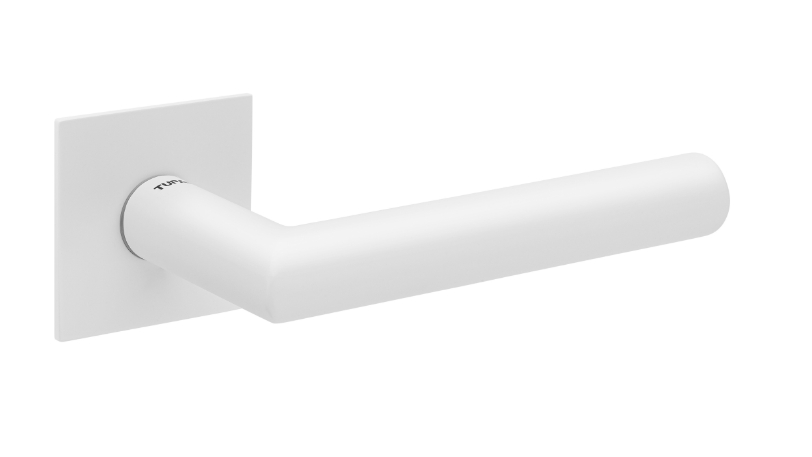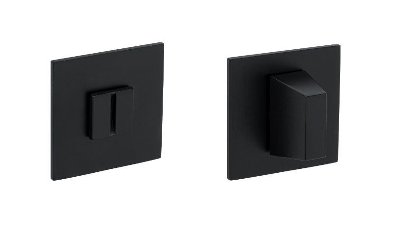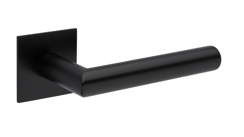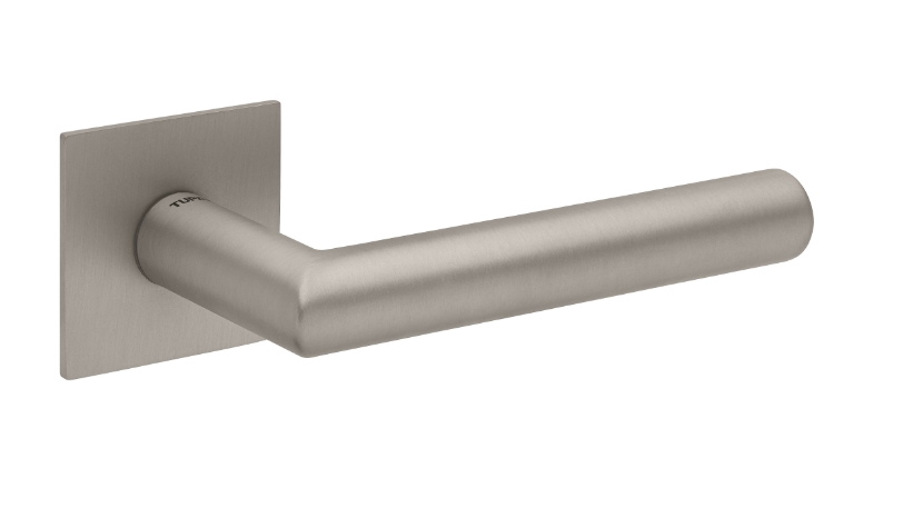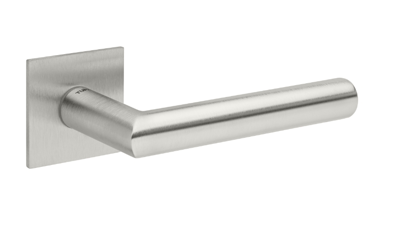 Zestaw klamek ze stali nierdzewnej na rozetach kwadratowych o grubości 2mm. Łatwy montaż na adapter wewnętrzny na tak zwany „klik”. Podwójny system sprężyn poziomujących rękojeści, zespolony z rozetą podklamkową. Kwadratowy trzpień 8×100 mm. Montaż na dwie śruby M6, niewidoczne po zamontowaniu., kolor 153