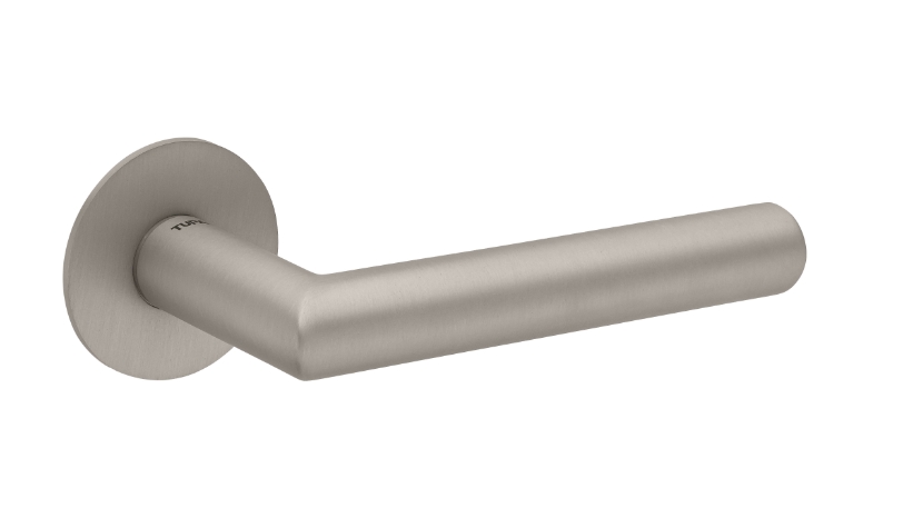 Zestaw klamek ze stali nierdzewnej na rozetach okrągłych o grubości 2mm. Łatwy montaż na adapter wewnętrzny na tak zwany „klik”. Podwójny system sprężyn poziomujących rękojeści, zespolony z rozetą podklamkową. Kwadratowy trzpień 8×100 mm. Montaż na dwie śruby M6, niewidoczne po zamontowaniu., kolor 142