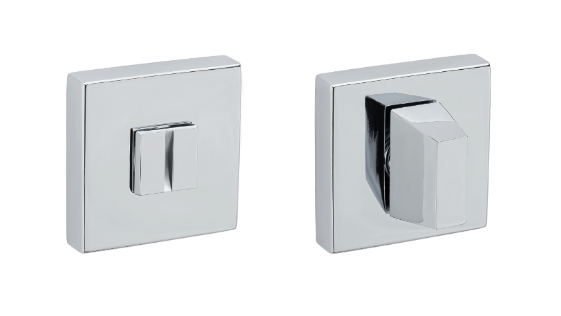 Zestaw klamek na rozetach kwadratowych 52mm. Łatwy montaż na adapterze metalowym na tak zwany „klik”. Podwójny system sprężyn poziomujący rękojeści. Kwadratowy trzpień 8×100 mm. Montaż na dwie śruby M6, niewidoczne po zamontowaniu. kolor 03