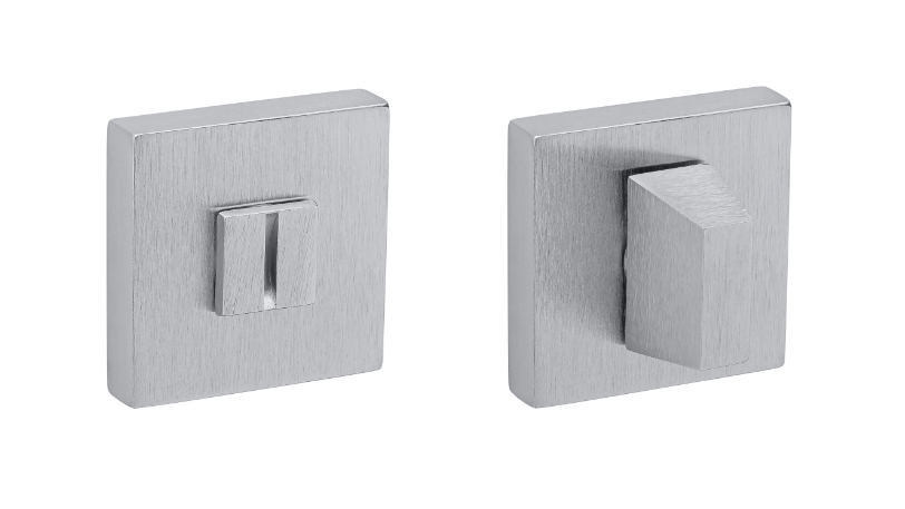 Zestaw klamek na rozetach kwadratowych 52mm. Łatwy montaż na adapterze metalowym na tak zwany „klik”. Podwójny system sprężyn poziomujący rękojeści. Kwadratowy trzpień 8×100 mm. Montaż na dwie śruby M6, niewidoczne po zamontowaniu. kolor 96