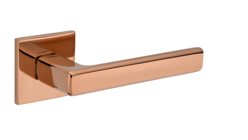 Zestaw klamek na rozetach kwadratowych o grubości 5mm. Łatwy montaż na adapter wewnętrzny na tak zwany „klik”. Podwójny system sprężyn poziomujących rękojeści, zespolony z rozetą podklamkową. Kwadratowy trzpień 8×100 mm. Montaż na dwie śruby M6, niewidoczne po zamontowaniu.