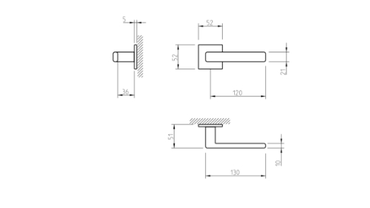 Zestaw klamek na rozetach kwadratowych o grubości 5mm. Łatwy montaż na adapter wewnętrzny na tak zwany „klik”. Podwójny system sprężyn poziomujących rękojeści, zespolony z rozetą podklamkową. Kwadratowy trzpień 8×100 mm. Montaż na dwie śruby M6, niewidoczne po zamontowaniu.