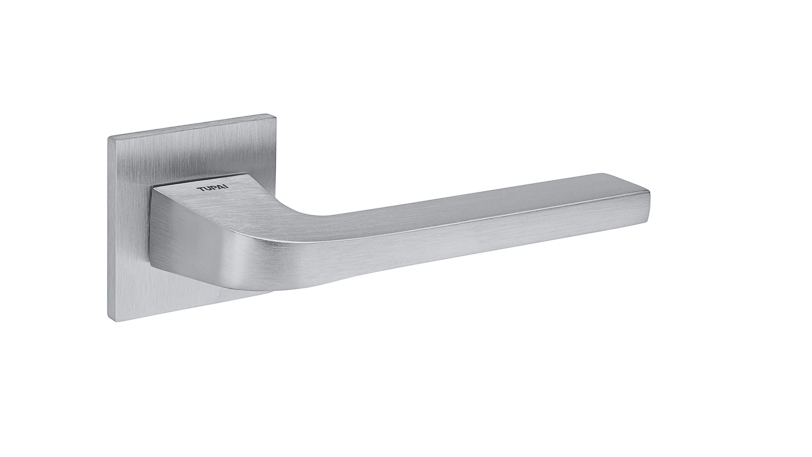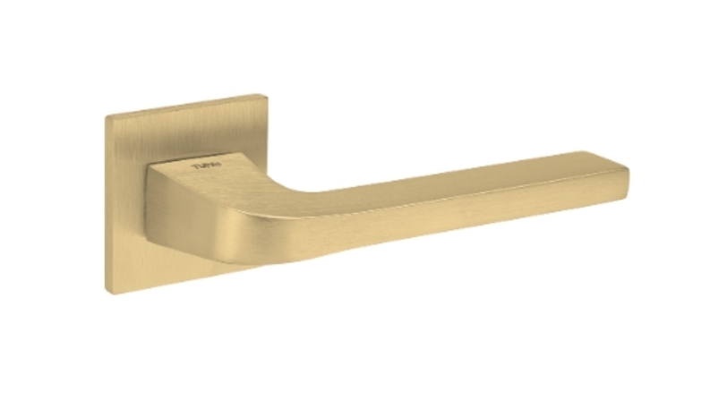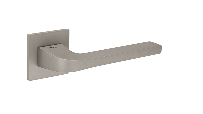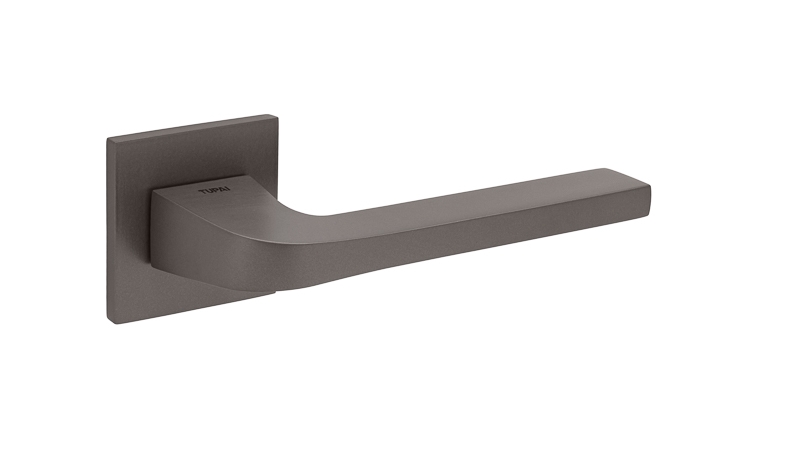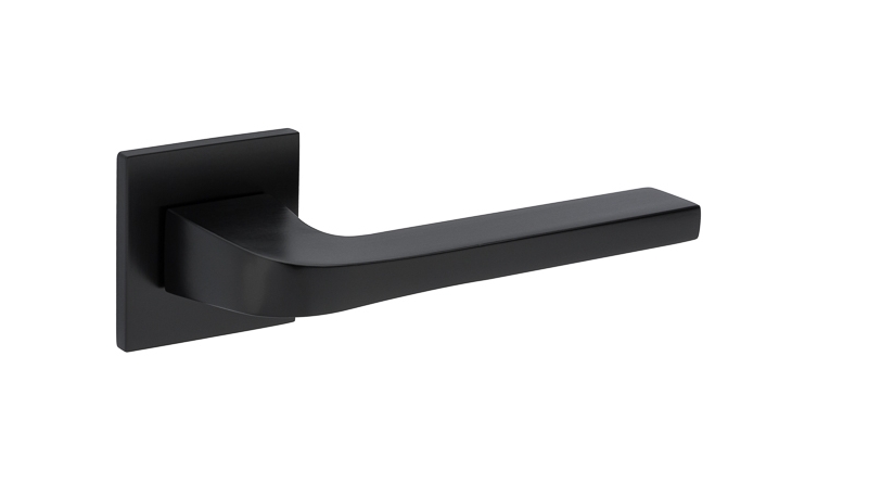 Zestaw klamek na rozetach kwadratowych o grubości 5mm. Łatwy montaż na adapter wewnętrzny na tak zwany „klik”. Podwójny system sprężyn poziomujących rękojeści, zespolony z rozetą podklamkową. Kwadratowy trzpień 8×100 mm. Montaż na dwie śruby M6, niewidoczne po zamontowaniu. kolor 141