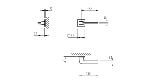 Zestaw klamek na rozetach kwadratowych o grubości 5mm. Łatwy montaż na adapter wewnętrzny na tak zwany „klik”. Podwójny system sprężyn poziomujących rękojeści, zespolony z rozetą podklamkową. Kwadratowy trzpień 8×100 mm. Montaż na dwie śruby M6, niewidoczne po zamontowaniu. kolor 142