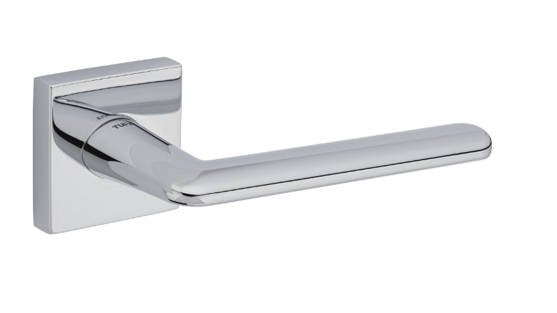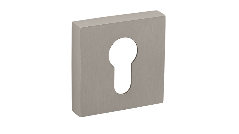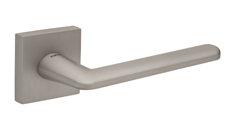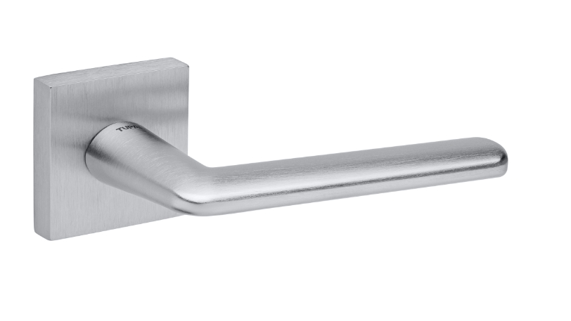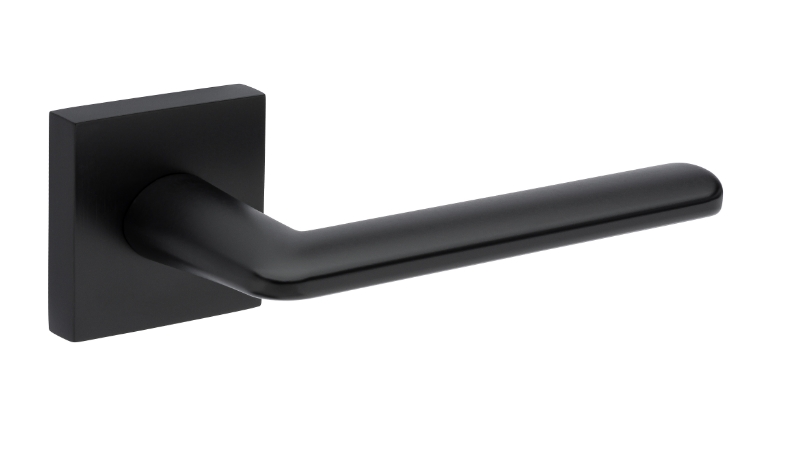 Zestaw klamek na rozetach kwadratowych 52mm. Łatwy montaż na adapterze metalowym na tak zwany „klik”. Podwójny system sprężyn poziomujący rękojeści. Kwadratowy trzpień 8×100 mm. Montaż na dwie śruby M6, niewidoczne po zamontowaniu. kolor 142