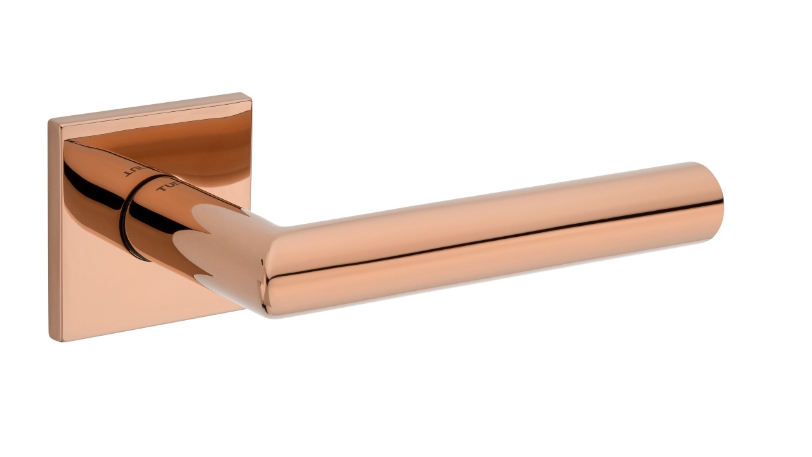 Zestaw klamek na rozetach kwadratowych o grubości 5mm. Łatwy montaż na adapter wewnętrzny na tak zwany „klik”. Podwójny system sprężyn poziomujących rękojeści, zespolony z rozetą podklamkową. Kwadratowy trzpień 8×100 mm. Montaż na dwie śruby M6, niewidoczne po zamontowaniu.