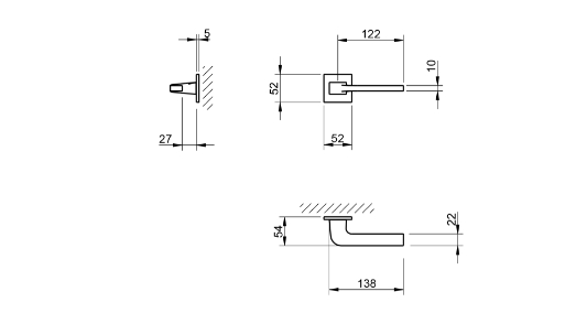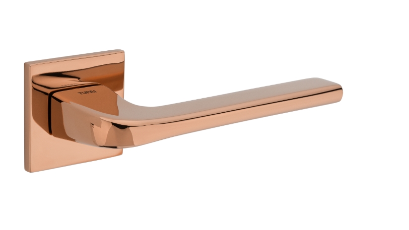Zestaw klamek na rozetach kwadratowych o grubości 5mm. Łatwy montaż na adapter wewnętrzny na tak zwany „klik”. Podwójny system sprężyn poziomujących rękojeści, zespolony z rozetą podklamkową. Kwadratowy trzpień 8×100 mm. Montaż na dwie śruby M6, niewidoczne po zamontowaniu.
