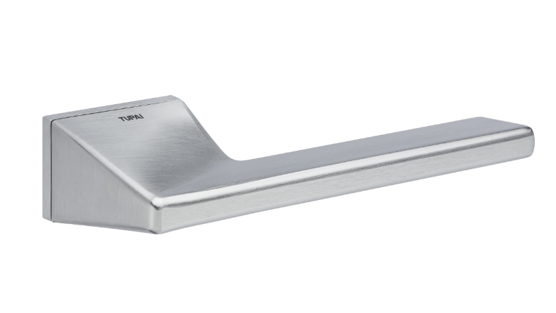 Zestaw klamek na rozetach prostokątnych 5mm o szer. 52mm. Łatwy montaż na adapterze metalowym na tak zwany „klik”. Podwójny system sprężyn poziomujących rękojeści. Kwadratowy trzpień 8×100 mm. Montaż na dwie śruby M6, niewidoczne po zamontowaniu.
