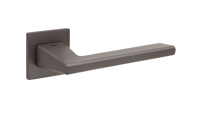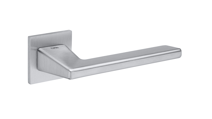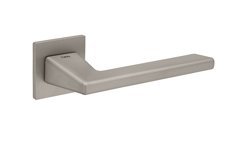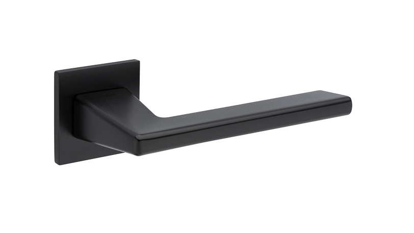 Zestaw klamek na rozetach kwadratowych o grubości 5mm. Łatwy montaż na adapter wewnętrzny na tak zwany „klik”. Podwójny system sprężyn poziomujących rękojeści, zespolony z rozetą podklamkową. Kwadratowy trzpień 8×100 mm. Montaż na dwie śruby M6, niewidoczne po zamontowaniu.
