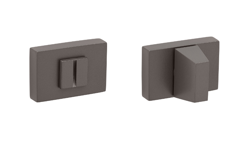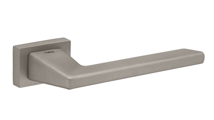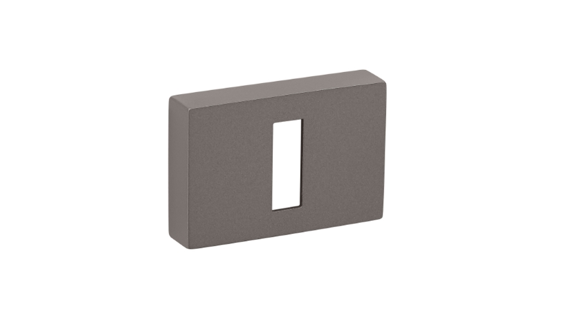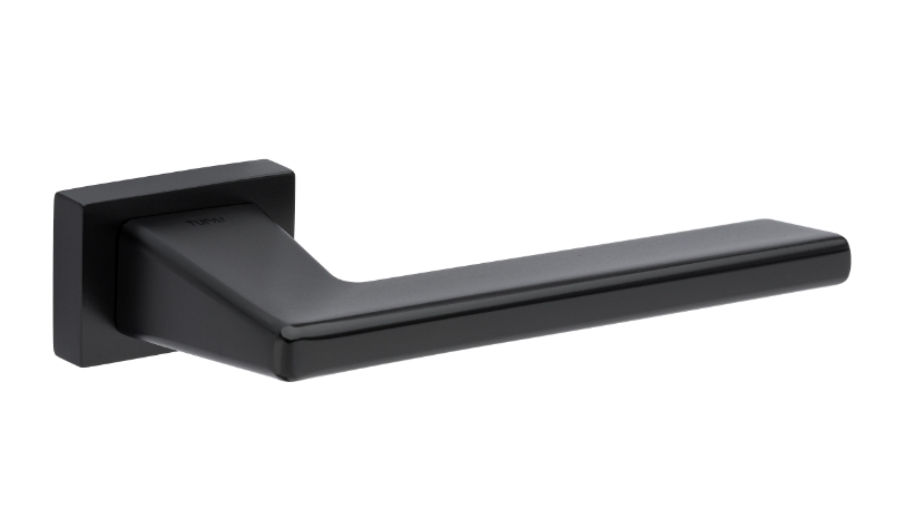 Zestaw klamek na rozetach prostokątnych 5mm o szer. 52mm. Łatwy montaż na adapterze metalowym na tak zwany „klik”. Podwójny system sprężyn poziomujących rękojeści. Kwadratowy trzpień 8×100 mm. Montaż na dwie śruby M6, niewidoczne po zamontowaniu.