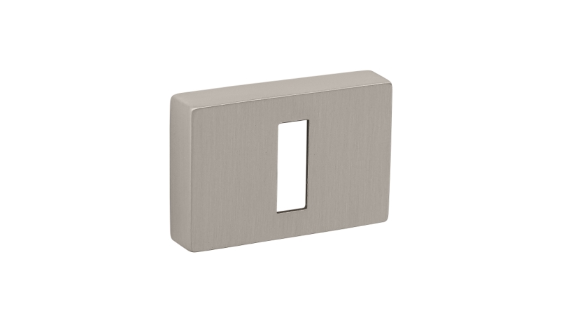 Zestaw klamek na rozetach prostokątnych 5mm o szer. 52mm. Łatwy montaż na adapterze metalowym na tak zwany „klik”. Podwójny system sprężyn poziomujących rękojeści. Kwadratowy trzpień 8×100 mm. Montaż na dwie śruby M6, niewidoczne po zamontowaniu.