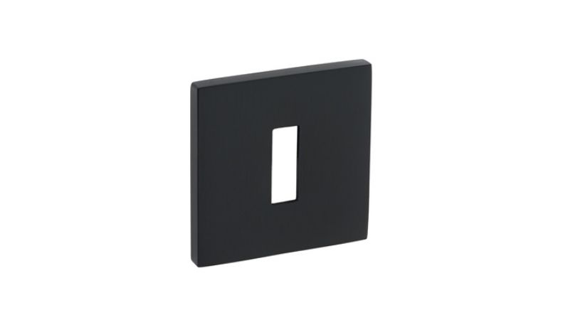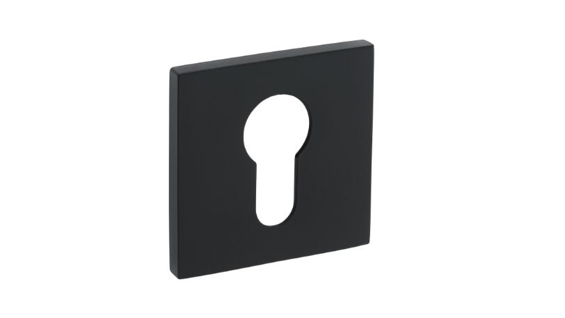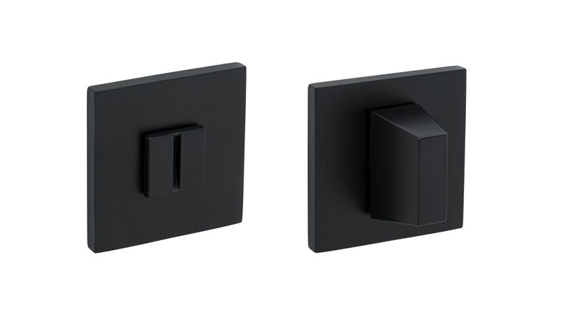 Zestaw klamek na rozetach kwadratowych o grubości 5mm. Łatwy montaż na adapter wewnętrzny na tak zwany „klik”. Podwójny system sprężyn poziomujących rękojeści, zespolony z rozetą podklamkową. Kwadratowy trzpień 8×100 mm. Montaż na dwie śruby M6, niewidoczne po zamontowaniu.