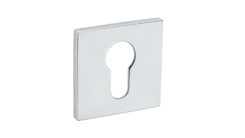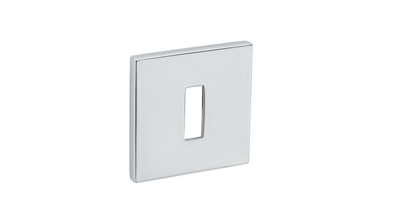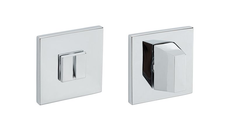 Zestaw klamek na rozetach kwadratowych o grubości 5mm. Łatwy montaż na adapter wewnętrzny na tak zwany „klik”. Podwójny system sprężyn poziomujących rękojeści, zespolony z rozetą podklamkową. Kwadratowy trzpień 8×100 mm. Montaż na dwie śruby M6, niewidoczne po zamontowaniu.