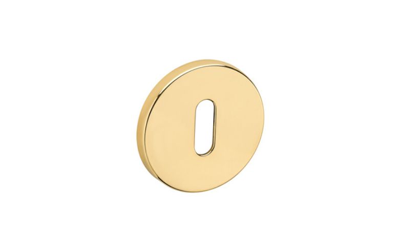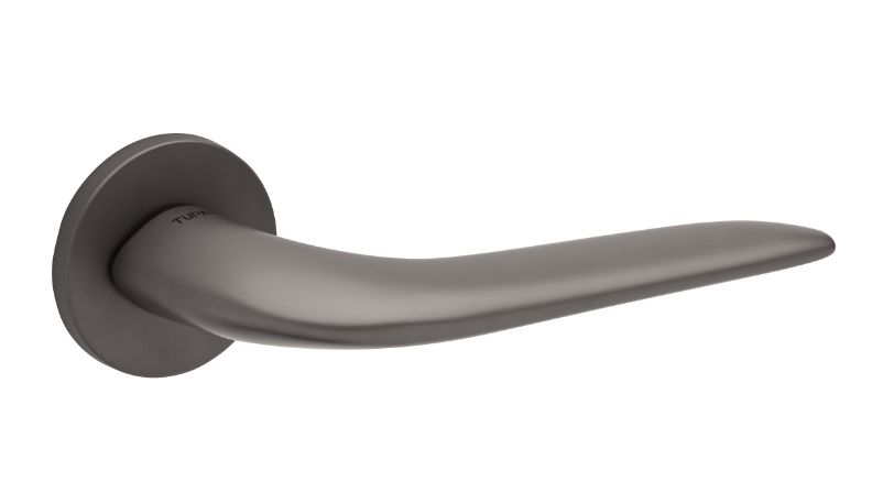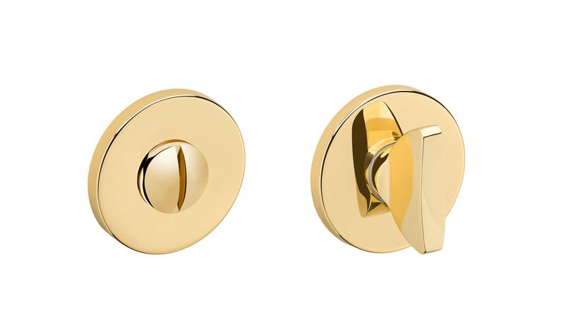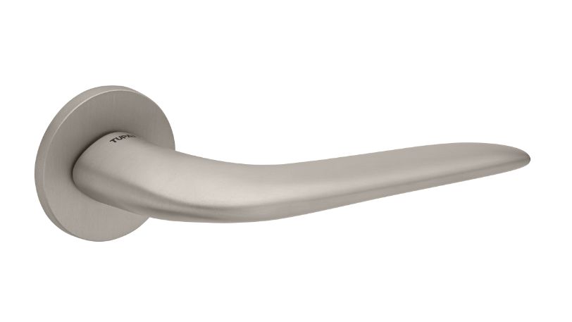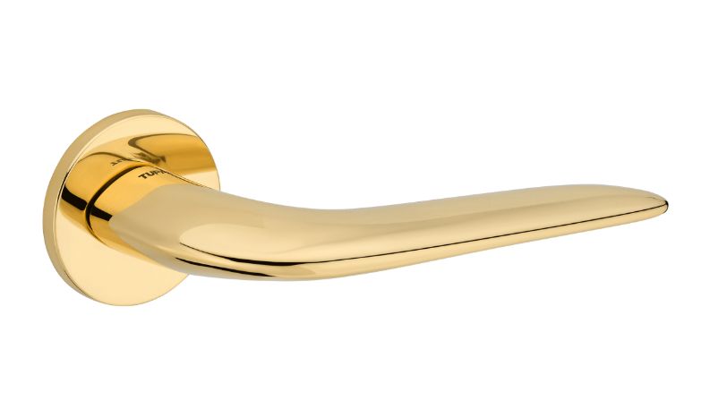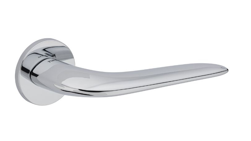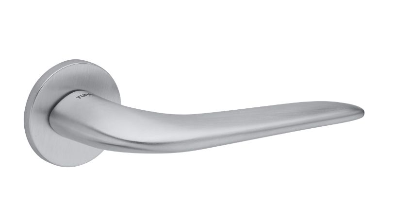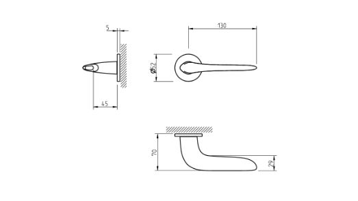 Zestaw klamek na rozetach okrągłych o grubości 5mm. Łatwy montaż na adapter wewnętrzny na tak zwany „klik”. Podwójny system sprężyn poziomujących rękojeści, zespolony z rozetą podklamkową. Kwadratowy trzpień 8×100 mm. Montaż na dwie śruby M6, niewidoczne po zamontowaniu.