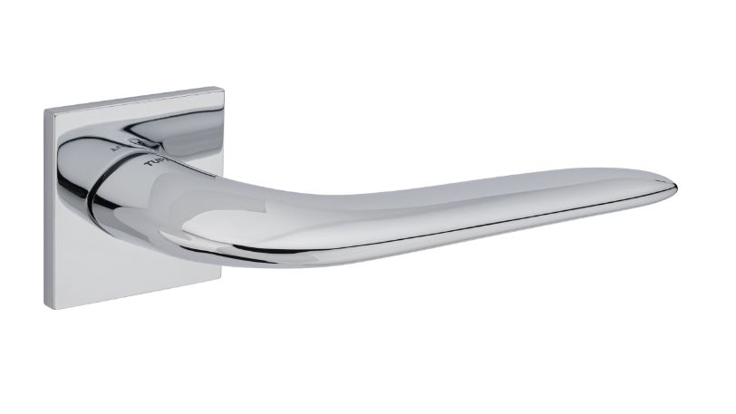 Zestaw klamek na rozetach kwadratowych o grubości 5mm. Łatwy montaż na adapter wewnętrzny na tak zwany „klik”. Podwójny system sprężyn poziomujących rękojeści, zespolony z rozetą podklamkową. Kwadratowy trzpień 8×100 mm. Montaż na dwie śruby M6, niewidoczne po zamontowaniu.