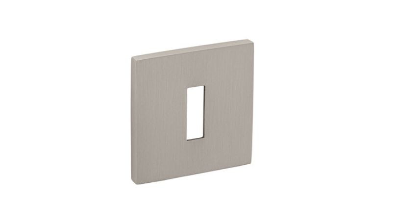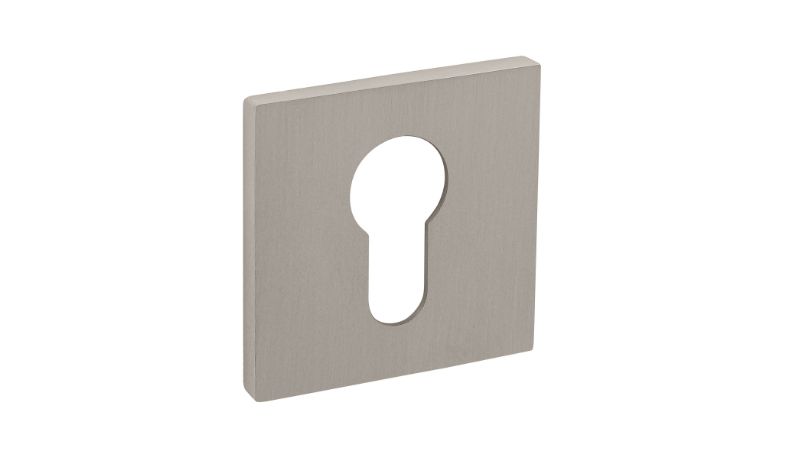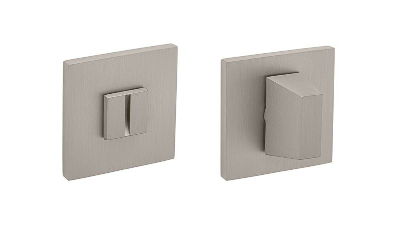 Zestaw klamek na rozetach kwadratowych o grubości 5mm. Łatwy montaż na adapter wewnętrzny na tak zwany „klik”. Podwójny system sprężyn poziomujących rękojeści, zespolony z rozetą podklamkową. Kwadratowy trzpień 8×100 mm. Montaż na dwie śruby M6, niewidoczne po zamontowaniu.