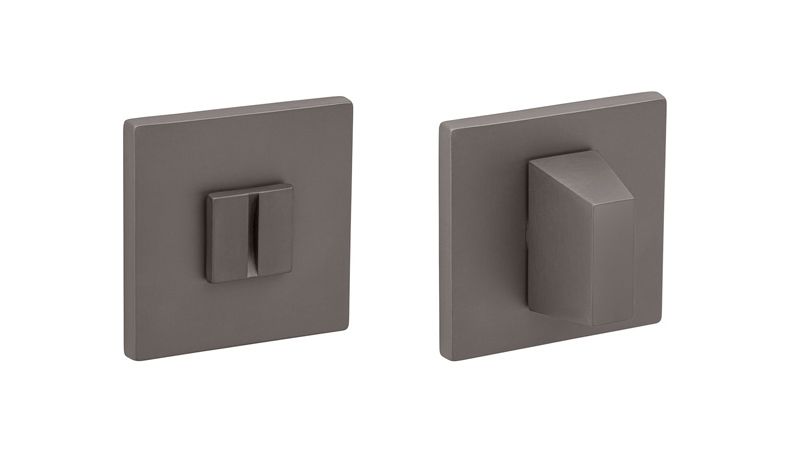 Zestaw klamek na rozetach kwadratowych o grubości 5mm. Łatwy montaż na adapter wewnętrzny na tak zwany „klik”. Podwójny system sprężyn poziomujących rękojeści, zespolony z rozetą podklamkową. Kwadratowy trzpień 8×100 mm. Montaż na dwie śruby M6, niewidoczne po zamontowaniu.