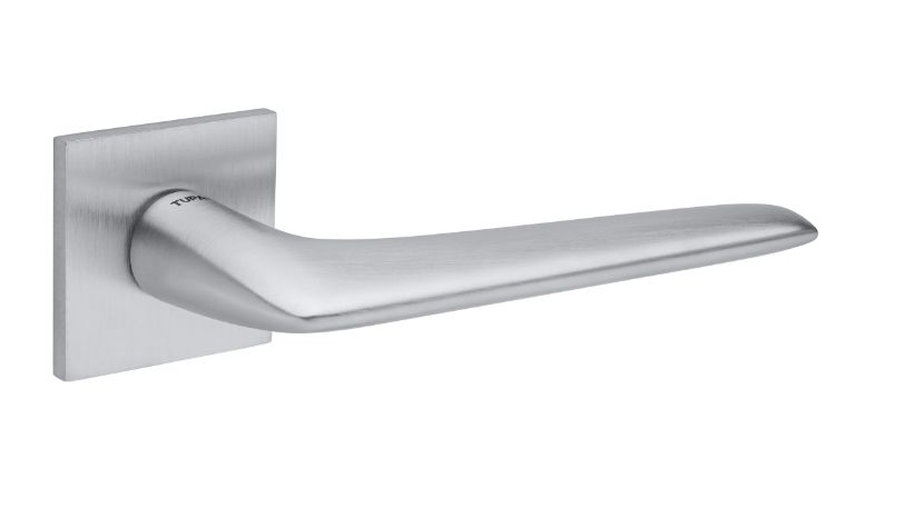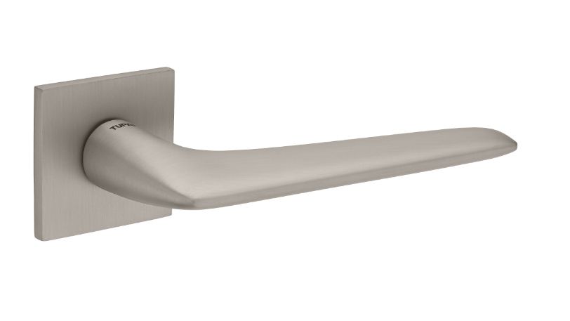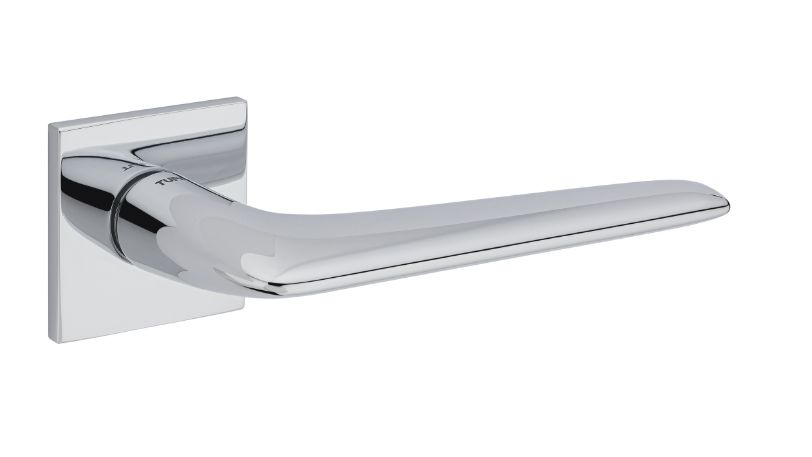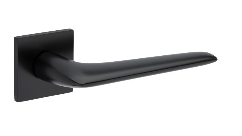 Zestaw klamek na rozetach kwadratowych o grubości 5mm. Łatwy montaż na adapter wewnętrzny na tak zwany „klik”. Podwójny system sprężyn poziomujących rękojeści, zespolony z rozetą podklamkową. Kwadratowy trzpień 8×100 mm. Montaż na dwie śruby M6, niewidoczne po zamontowaniu.