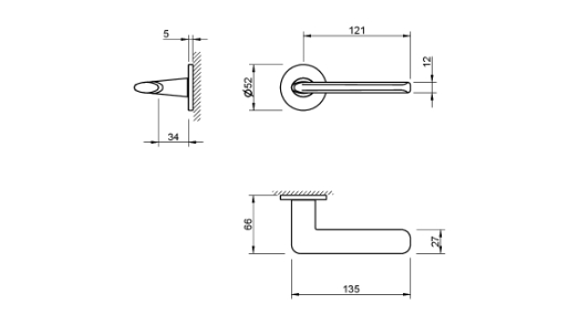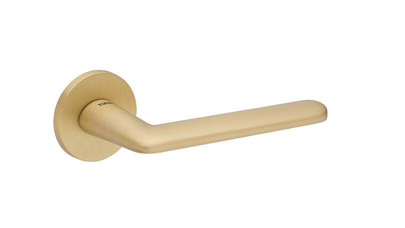 Zestaw klamek na rozetach okrągłych o grubości 5mm. Łatwy montaż na adapter wewnętrzny na tak zwany „klik”. Podwójny system sprężyn poziomujących rękojeści, zespolony z rozetą podklamkową. Kwadratowy trzpień 8×100 mm. Montaż na dwie śruby M6, niewidoczne po zamontowaniu.