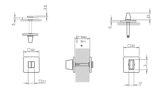 Zestaw rozet do drzwi łazienkowych na szyldach kwadratowych 52mm o grubości 5mm. Możliwość awaryjnego otwierania z zewnątrz. Trzpień kwadratowy 4×4 mm. kolor 158