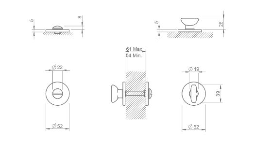 Zestaw rozet do drzwi łazienkowych na szyldach okrągłych Ø52mm o grubości 5mm. Możliwość awaryjnego otwierania z zewnątrz. Trzpień kwadratowy 4x4mm. kolor 153