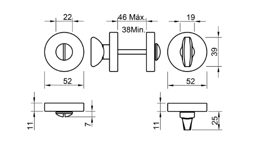 Zestaw rozet okrągłych Ø52mm o grubości 11mm, do drzwi łazienkowych.